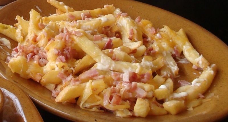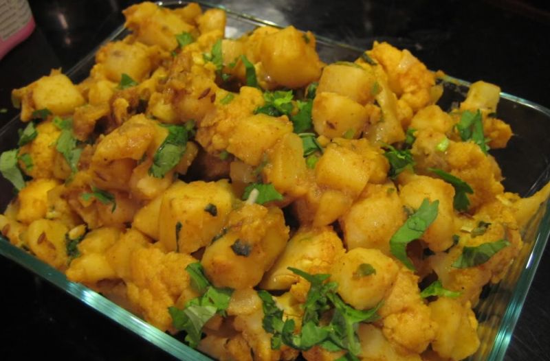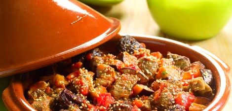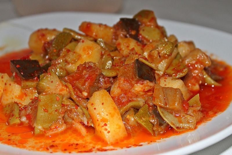 Aardappels, vlees en diverse groenten in tomatensaus.