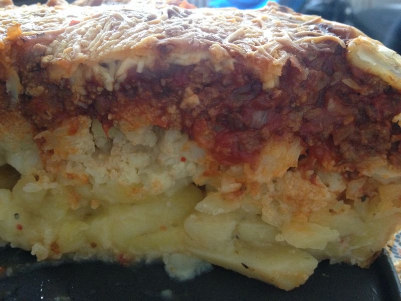 Hartige taart met gehaktsaus, bloemkool en aardappels.