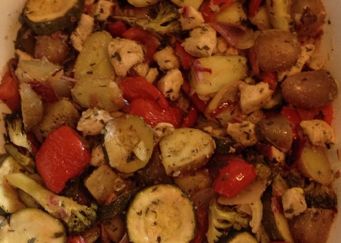 Gezonde ovenschotel met aardappel,ui, courgette en paprika.