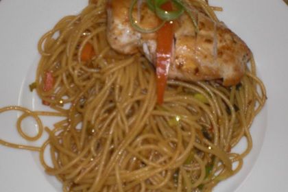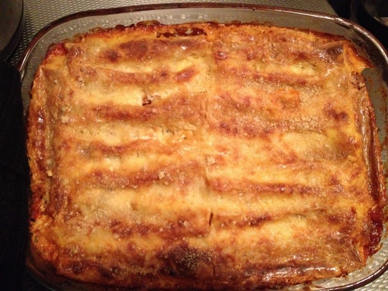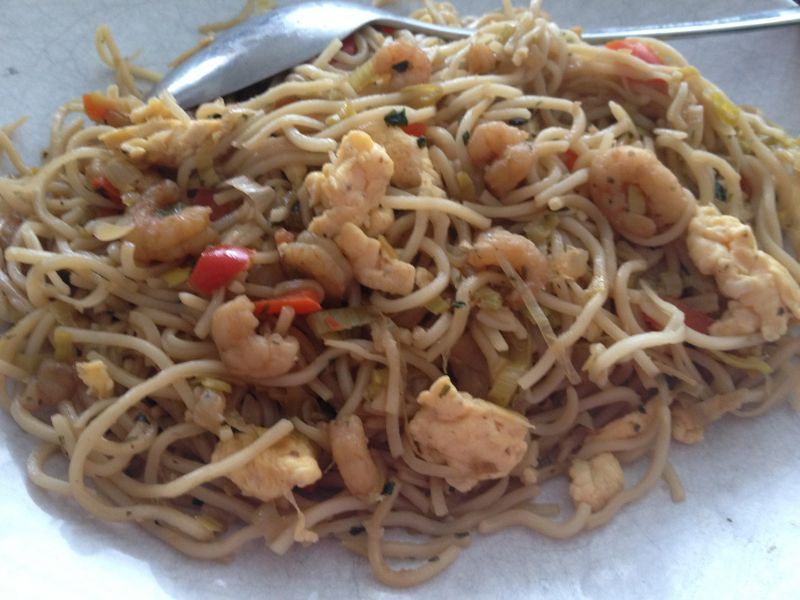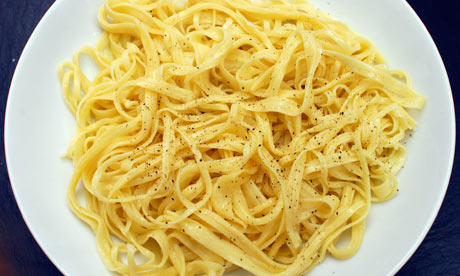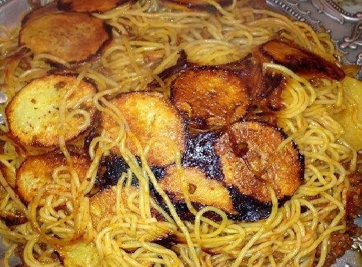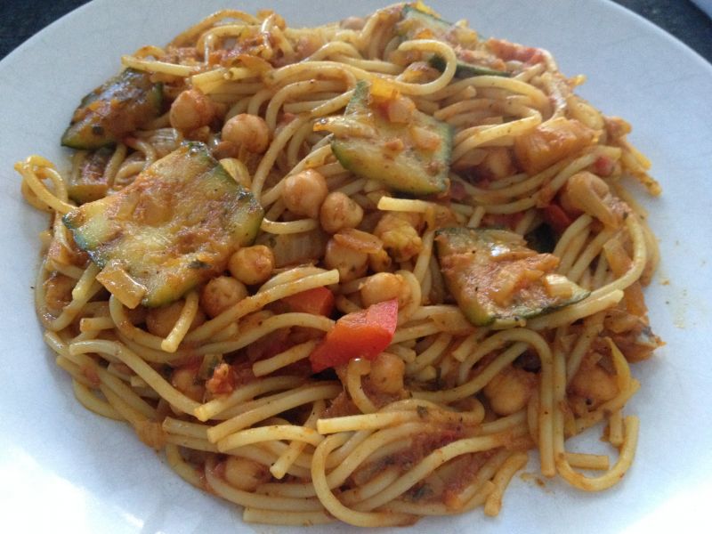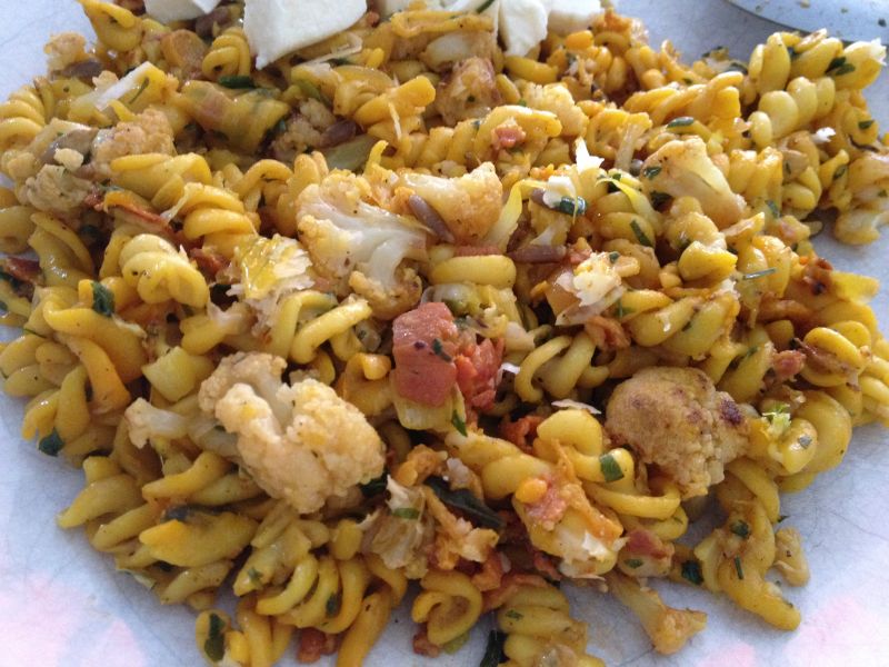 Spaghetti met bloemkool, tomatensaus, garnaaltjes en snufje kaneel .